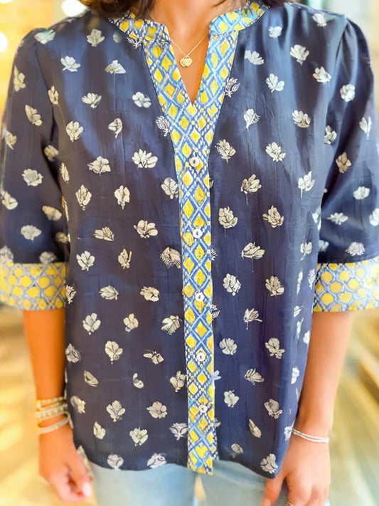 Floral Print Half Sleeve Contrast Trim Blouse